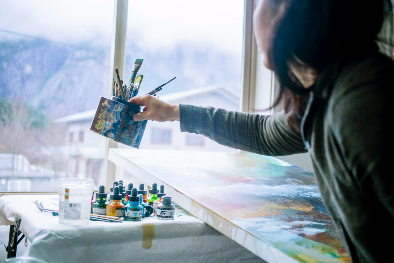 Lan left the animation company she had worked at for seven years and moved to Squamish, picking up odd jobs around town and spending her free time running and climbing. The physical freedom created a space for Lan to gravitate back to painting. “I just like observing and taking in details and what’s going on around me—anything, a certain colour, or a certain shape of a building or a person’s face. Inspiration from tiny details, moments, all put together.”Lan’s relationship with Ben and his life of simplicity has helped her find her happy place, a place that allows for artistic growth. Not that it is always an easy path, but it is hers. “As a full-time artist, it’s been hard,” she admits. “I still enjoy painting, but it’s hard not to think about the money… You gotta live, after all.”